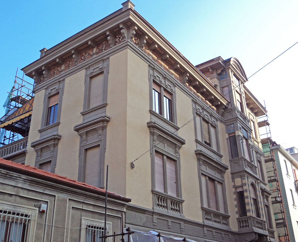 Ristrutturazione di fabbricato con recupero del sottotetto e creazione di tre unità abitative in via Roma a Chieri. Restauro delle facciate e degli apparati decorativi in stile Liberty.